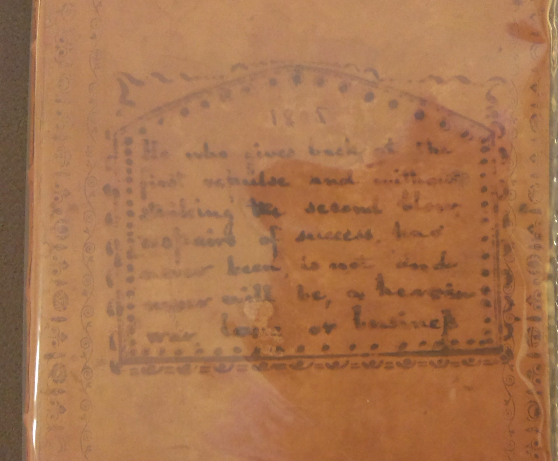 His spidery handwriting is hard to read and the glare from the plastic cover makes it even more difficult. Here’s the transcription: