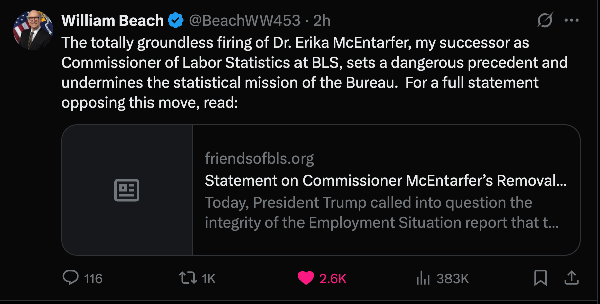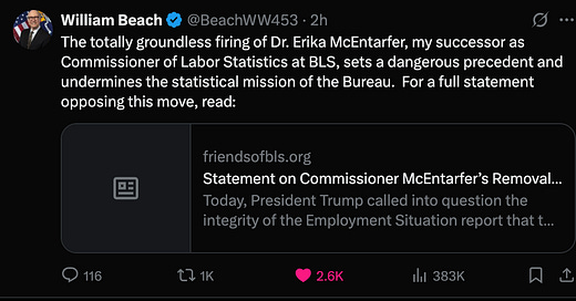 Trump then fired the current BLS Commissioner, Erika McEntarfer, and accused her of being politically motivated.