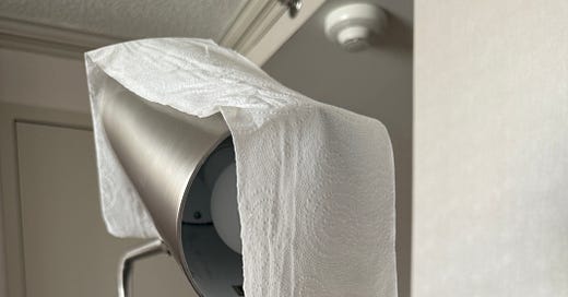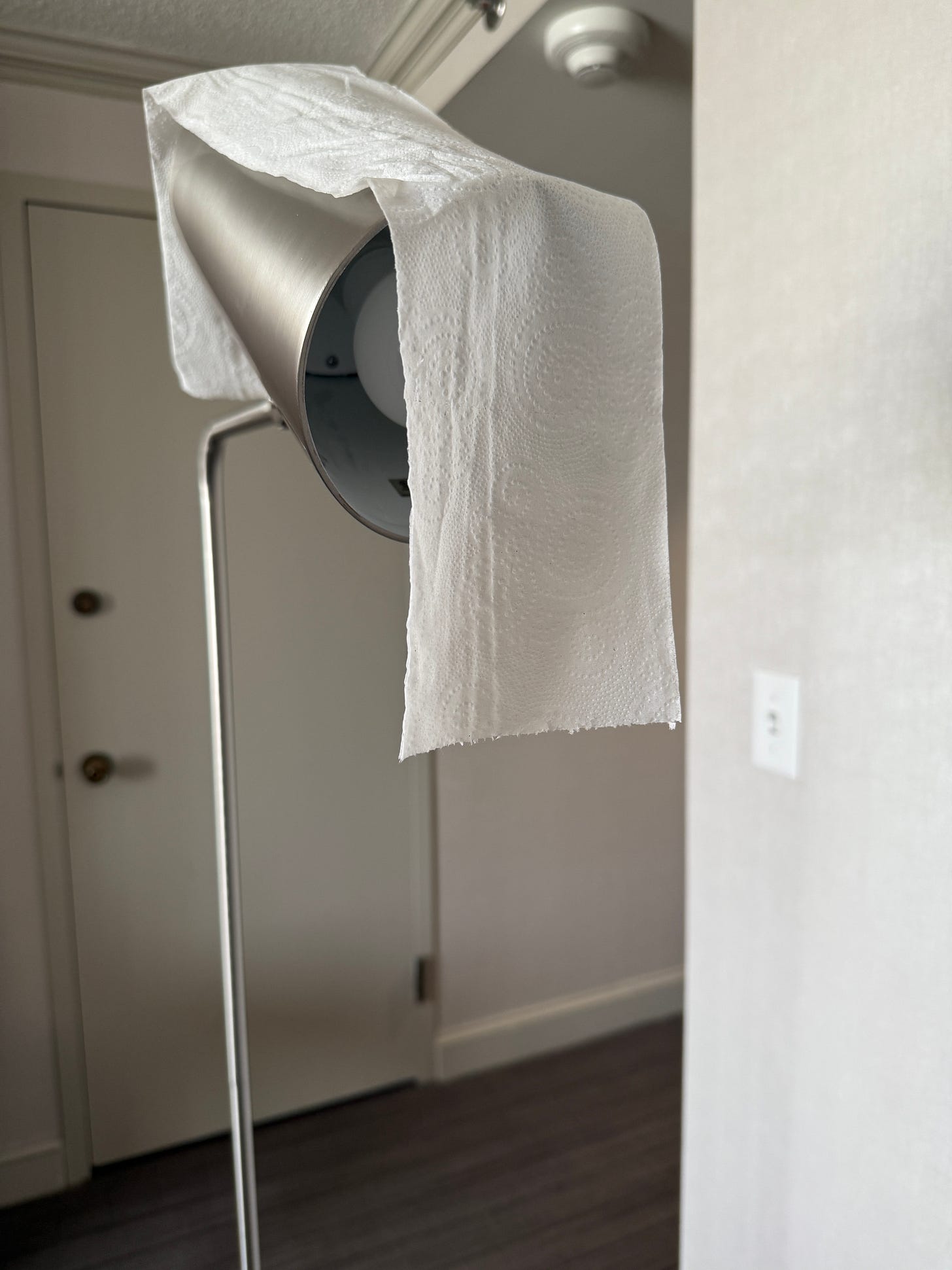 Bringing my webcam and a microphone is one thing; they’re super small and easy to throw in pretty much any bag. But I’m not about to bring lighting equipment with me on a plane just for a 15 minute TV hit so I have to make do with hotel lights. Sometimes, this is really, really difficult. This time, though, it was remarkably easy with this room having a lamp that was effectively a track light that I could move around on the floor and pivot up and down. After moving it into position and testing it, it was pretty clear that I needed something to diffuse the light a bit. Obviously, I didn’t bring anything with me to do that, so I used a sheet of toilet paper draped over the light.